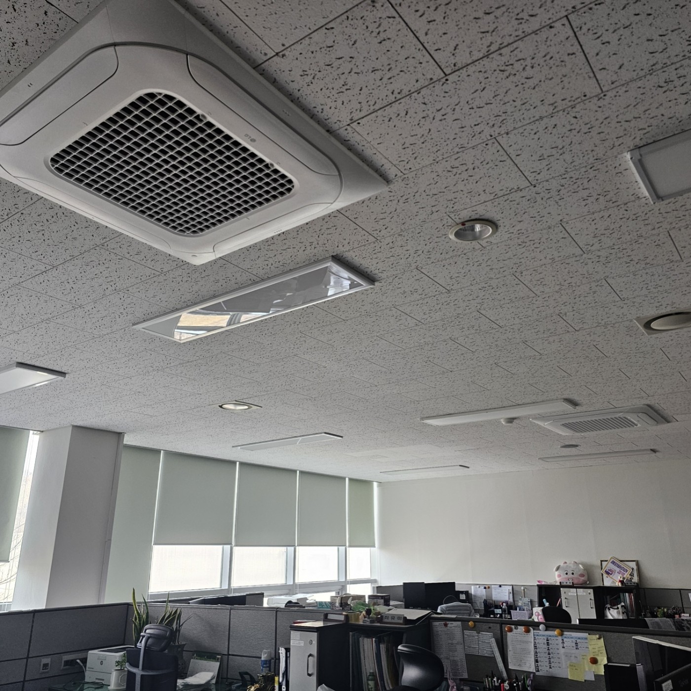 기존 천장마감재가 오래되어 색바램현상이 있어 이질적이나, 전체 천장을 교체하지 않는이상 감안해야 하는 작업이다.